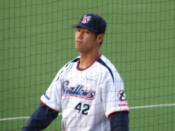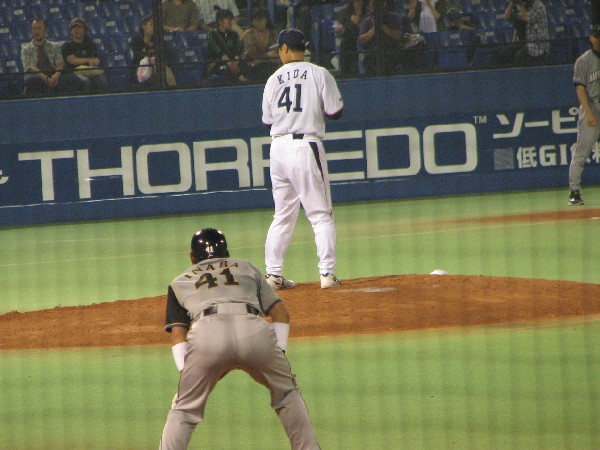 | かつて、ヤクルトで背番号41を付けていた稲葉が1塁ランナーでいるためか、なんとなく投げにくそうな木田。 |