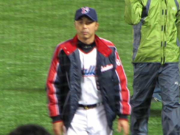 2008年3月29日の巨人との開幕第2戦でヒーローになり、試合終了後ライトスタンド前でファンに挨拶したあとの宮本慎也。 素になった顔は疲れがにじんでいた。 |