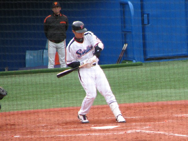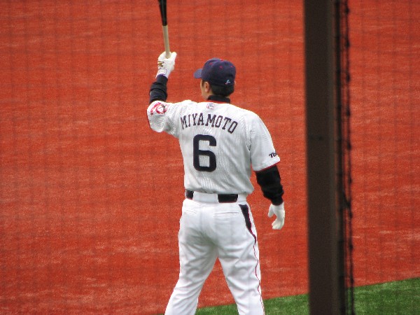 | 試合前に素振りをするふりをしながらDDSを眺める宮本慎也 |