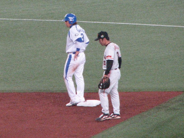 巨人坂本の悪送球に助けられ2塁を陥れる。隣は仏頂面の木村拓也。