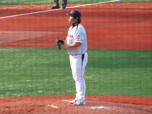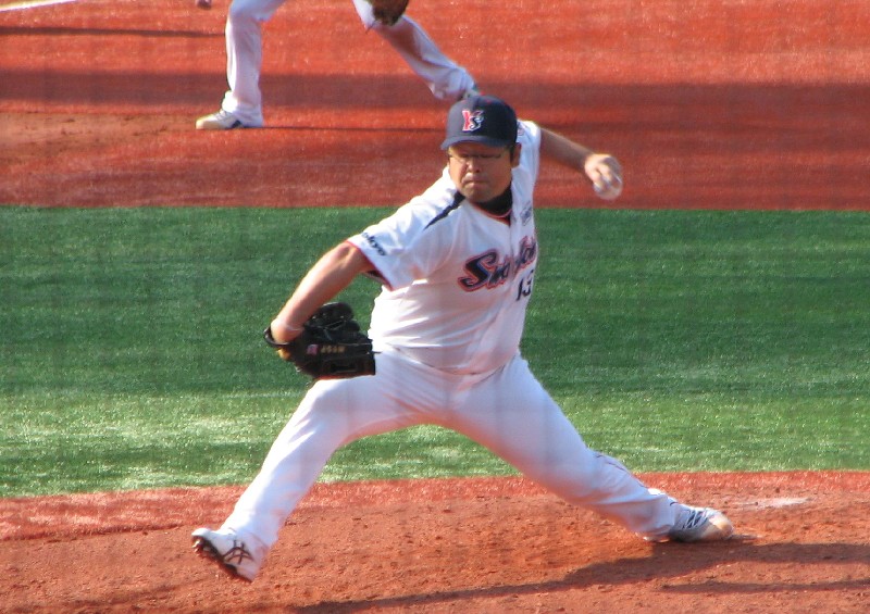 猛然と投げる佐藤賢。まさに投げるメタボ。