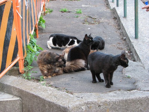 | 階段下から見て階段左側で6匹もノラ猫が固まっていた。 |