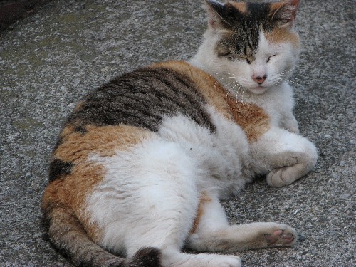 | 階段右側で一匹だけくつろいでいたノラ猫。 |