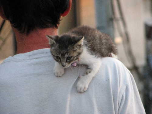 | 階段上でオジサンの肩にしがみついていた子猫。 |