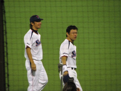 オーロラビジョンに映る若き日の姿に笑う古田。池山の引退試合も若き日のとんでもない髪型を映しだし場内大爆笑だった。 |