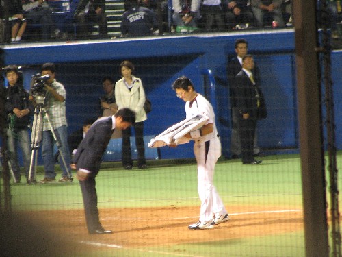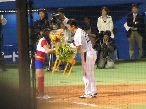 スワローズ公認サポーターつばめっ娘クラブ(何ちゅー名前だ!)の代表で相澤仁美が花束を渡す。来年のサポーターは相武紗季で頼む! |