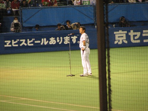 挨拶をする古田。「また会いましょう」のセリフに大歓声が。 |