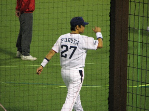 名残惜しげにスタンドを見上げる古田。 |