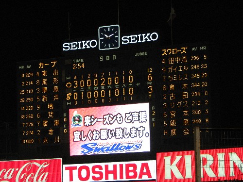 スコアボードにねぎらいの言葉が浮かび上がる。 |