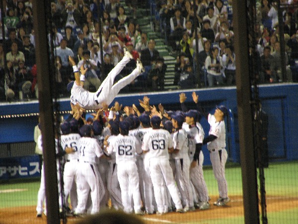 守備位置のホームベース上で胴上げをされる古田。 |