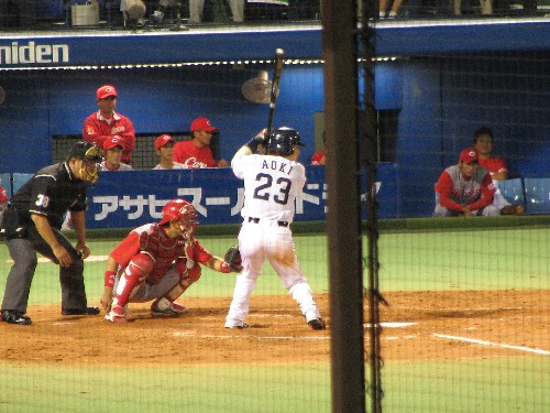 この日、次代のリーダーとして期待をこめて4番に抜擢した青木は内野安打で古田につないだ。 |