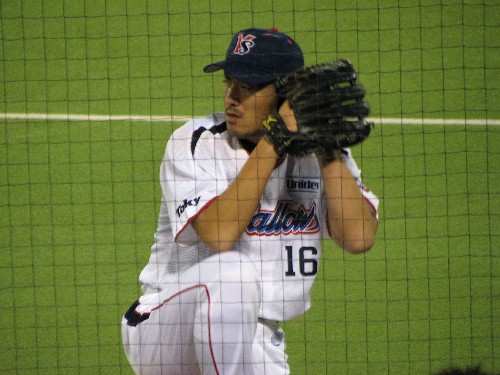 投げる前に目を閉じる一久。写真をバシバシ撮られていた。 |