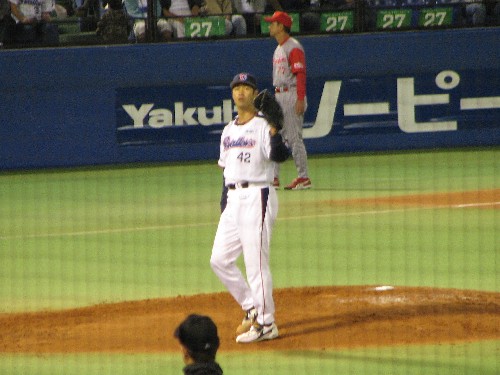 7回表、右腕をグルグル振り回しながら登場した好調のシコースキー。栗原にヒットを打たれるも三人で切り抜ける。 |