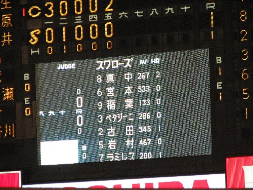 5回終了時にオーロラビジョンに映し出された日本一に輝いた2001年のオーダー。稲葉、ペタ、古田の豪華なクリーンナップに、「セのイチロー」などととんでもないことを言われた真中やインディアンス岩村の名前が。 |