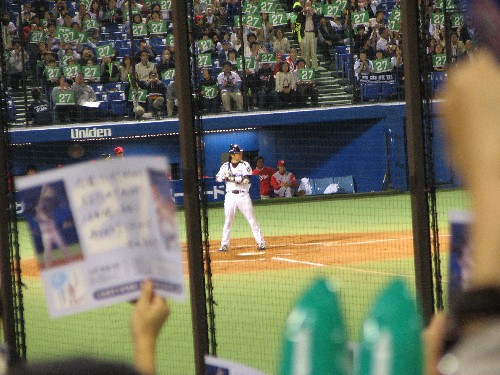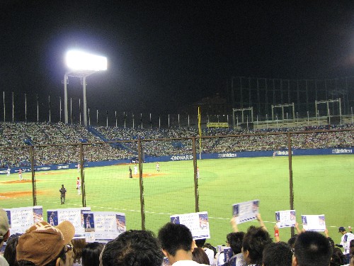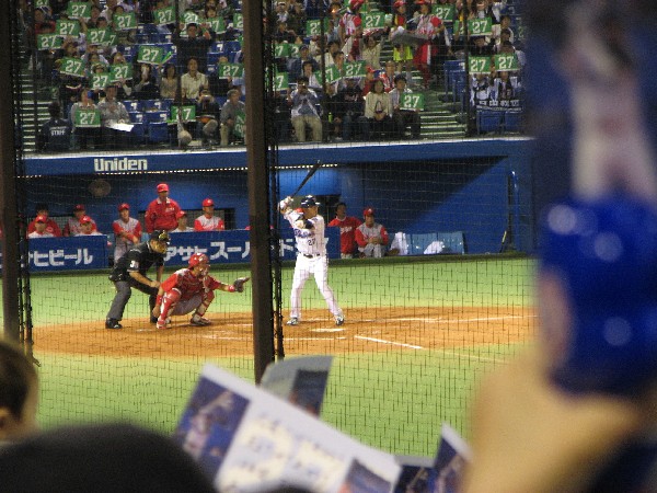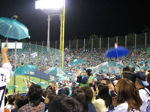 古田はライトフライに倒れたが、リグスのセンターへの特大犠飛で1点を返し1対3に。ライトスタンドは傘の花が満開だ。 |