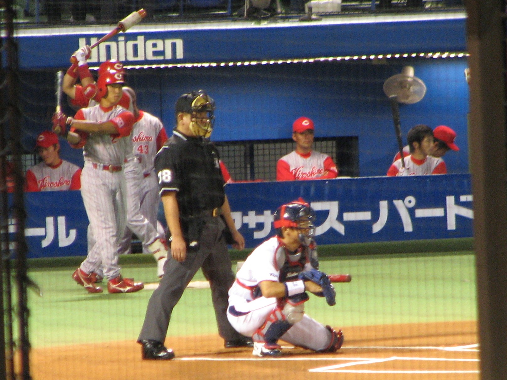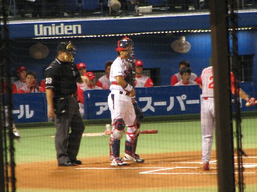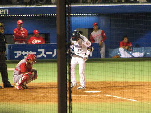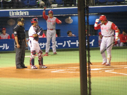古田に挨拶をして打席に入る栗原。この日の広島ナインは恐らく全員が挨拶をしていた。 |
